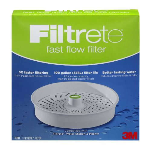 The Filtrete Fast Flow Replacement Filter works with the Filtrete Water Station and/or the Filtrete Water Pitcher. It reduces chlorine and sediment for improved taste, odor and clarity. The filter lasts up to 100 gallons, approximately 3 months and has a filter change indicator built in.